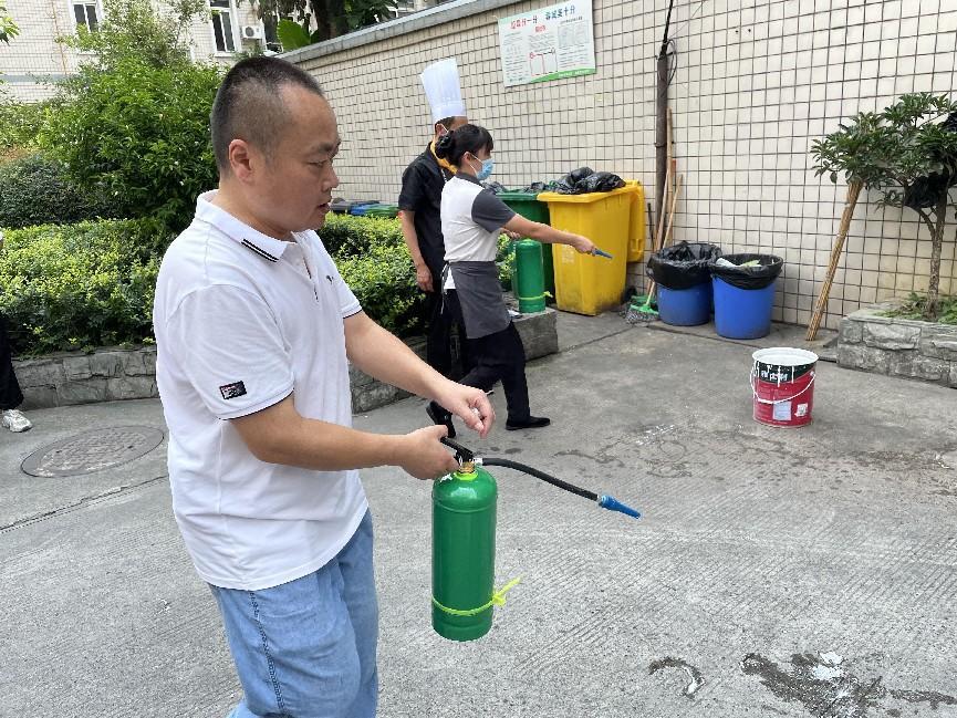 后勤服務部工作人員對于如何正確操作滅火器、如何處置突發(fā)火災事件進行了生動講述,隨后帶領大家實際操作了水基滅火器。并要求食堂人員必須熟練掌握使用滅火器。