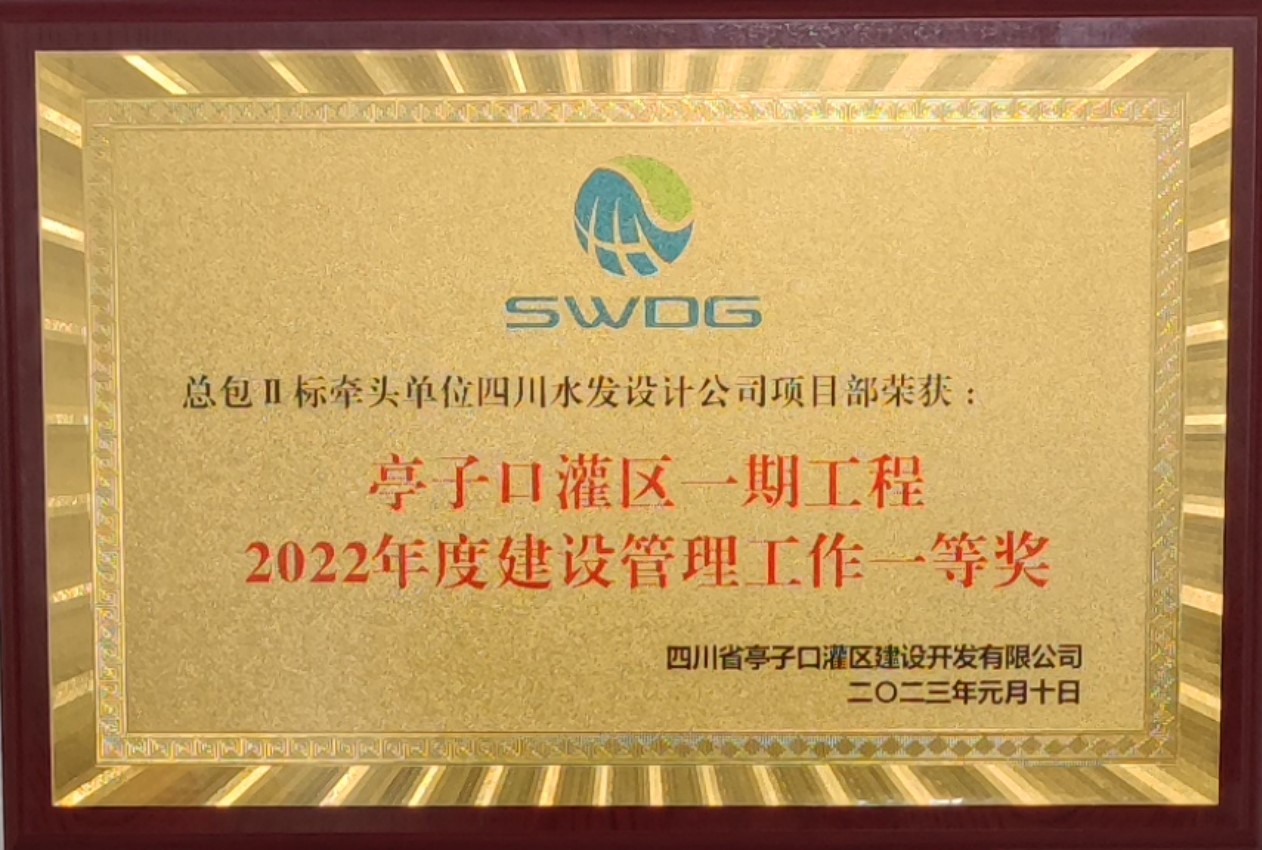2023年是深入貫徹落實黨的二十大精神的開局之年,設計公司以習近平新時代中國特色社會主義思想為指導,嚴格執(zhí)行黨中央、國務院、省委和水發(fā)集團黨委決策部署,全面貫徹新發(fā)展理念,敢于擔當、奮力拼搏,扎實推動新階段水利事業(yè)高質量可持續(xù)發(fā)展。在四川省亭子口灌區(qū)建設開發(fā)有限公司組織召開的2022年度建設管理暨安全生產(chǎn)工作總結會上,四川水發(fā)設計公司牽頭的亭子口灌區(qū)一期工程項目榮獲2022年度建設管理工作一等獎。此次榮譽的獲得既是對水發(fā)設計公司過去工作成績的肯定,也是對水發(fā)設計公司新的一年工作的激勵和鞭策。2023年水發(fā)設計公司將以此為新的起點,揭開新的篇章,我們也將再接再厲,以時不我待的精神爭創(chuàng)下一個“一等獎”。