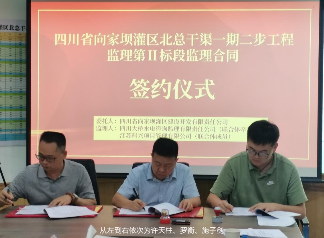 7月31日上午,四川大橋水電咨詢監(jiān)理有限責(zé)任公司(聯(lián)合體牽頭)、江蘇科興項(xiàng)目管理有限公司(聯(lián)合體成員)與四川省向家壩灌區(qū)建設(shè)開發(fā)有限責(zé)任公司共同簽訂了《四川省向家壩灌區(qū)北總干渠一期二步工程監(jiān)理第Ⅱ標(biāo)段監(jiān)理合同》。