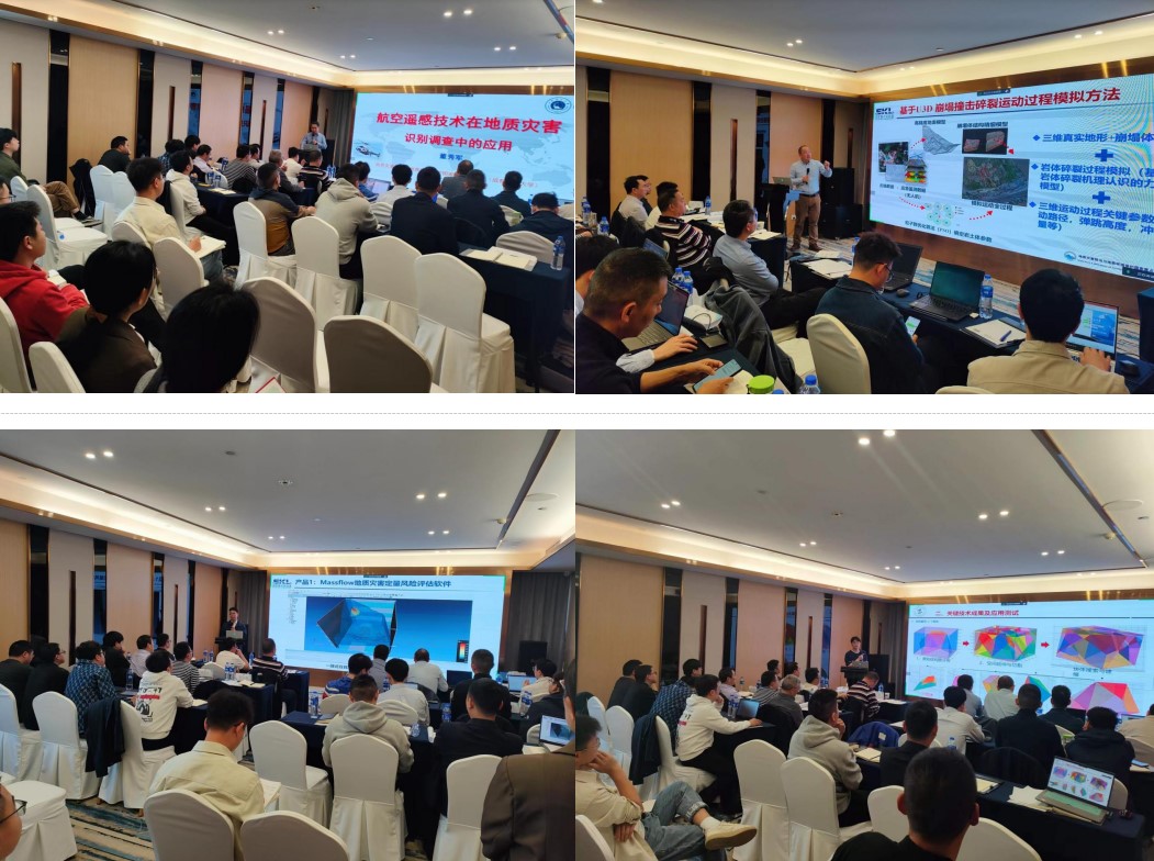 土木工程系副主任黃健博導、楊東旭副教授、軟件開發(fā)技術總監(jiān)溫東及鄧博博士分別作了題為《考慮動力破碎的高位巖崩運動過程三維模擬方法研究》、《地表災害動力過程數(shù)值模擬技術及定量評估系列軟件》、《EarthSurvey地質(zhì)災害解譯軟件平臺研發(fā)及應用》、《地下工程圍巖數(shù)字化三維解析重構與智能評價系統(tǒng)》的專題報告,并對地下工程圍巖數(shù)字化軟件進行現(xiàn)場演示。